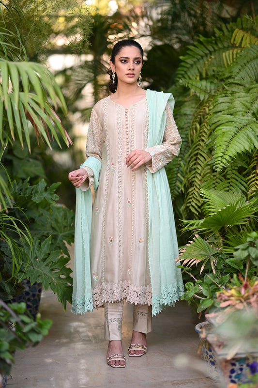 Blush pink Swiss lawn with purple chicken angarkha style shirt